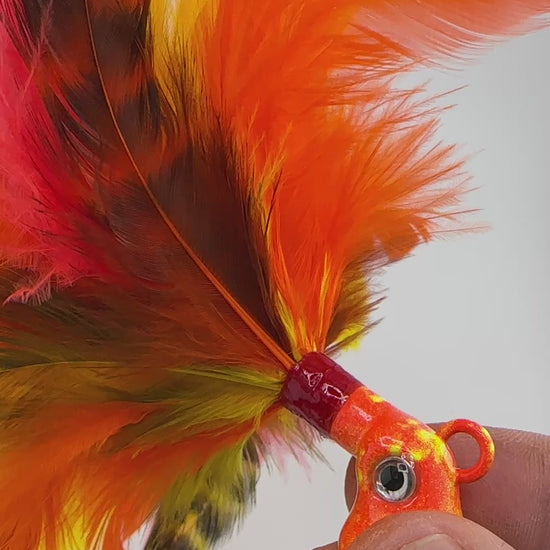 9" Overall Length - Double-Stacked Orange, Yellow and Red Feathers with Orange and Yellow Grizzly Feathers, FLAME Octopus head with Mustad 8/0 2x Strong - This Thing is LOADED!