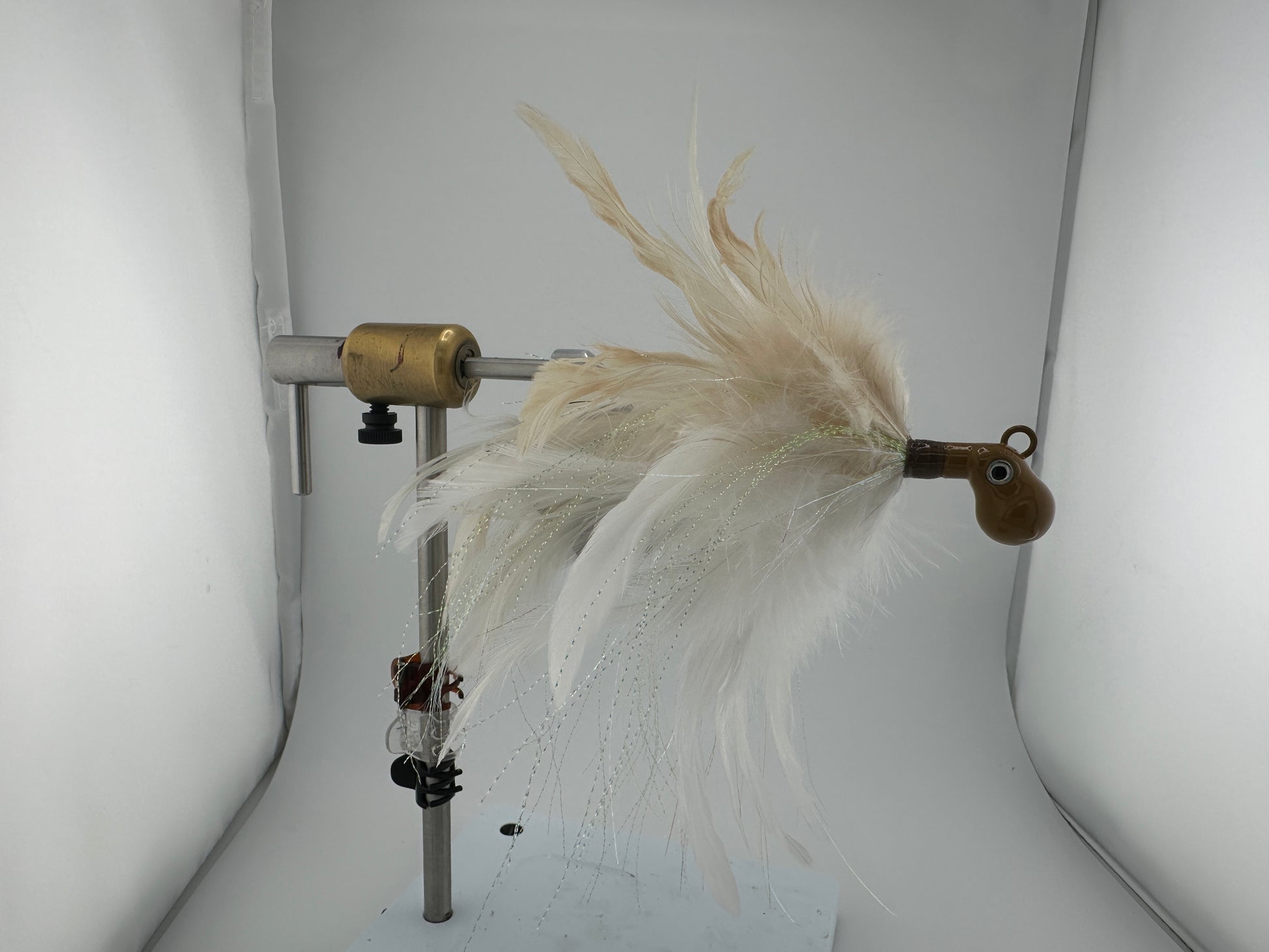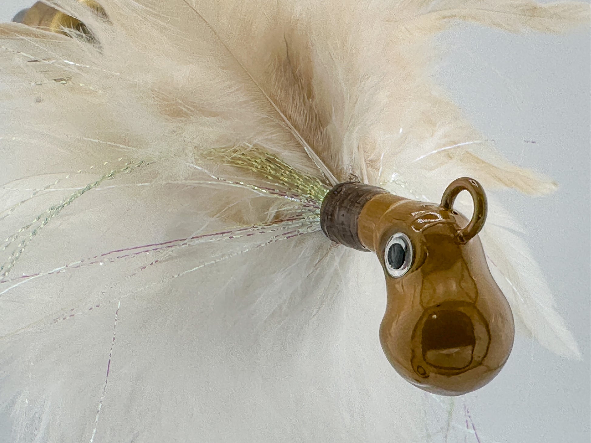 Tan & white feathers with pearl & chartreuse flash on a custom painted jig head
