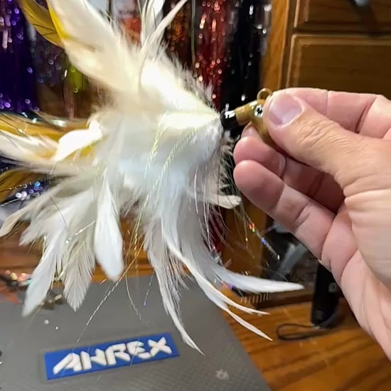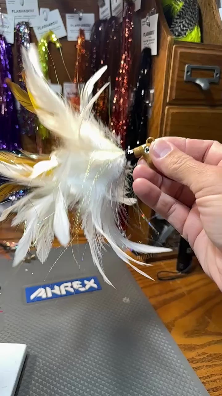 *Jig appearance may vary slightly based on material availability at time of order, we are a custom shop not a mass producer. Every jig is artistically made and not a "cookie cutter" product. At time it may be required to use a similar but alternate color jig head based on availability. Standard overall length is 7-9" and mainly dictated by the feathers available at time of hand-tying your jig. Contact us for special requests or more information prior to ordering.