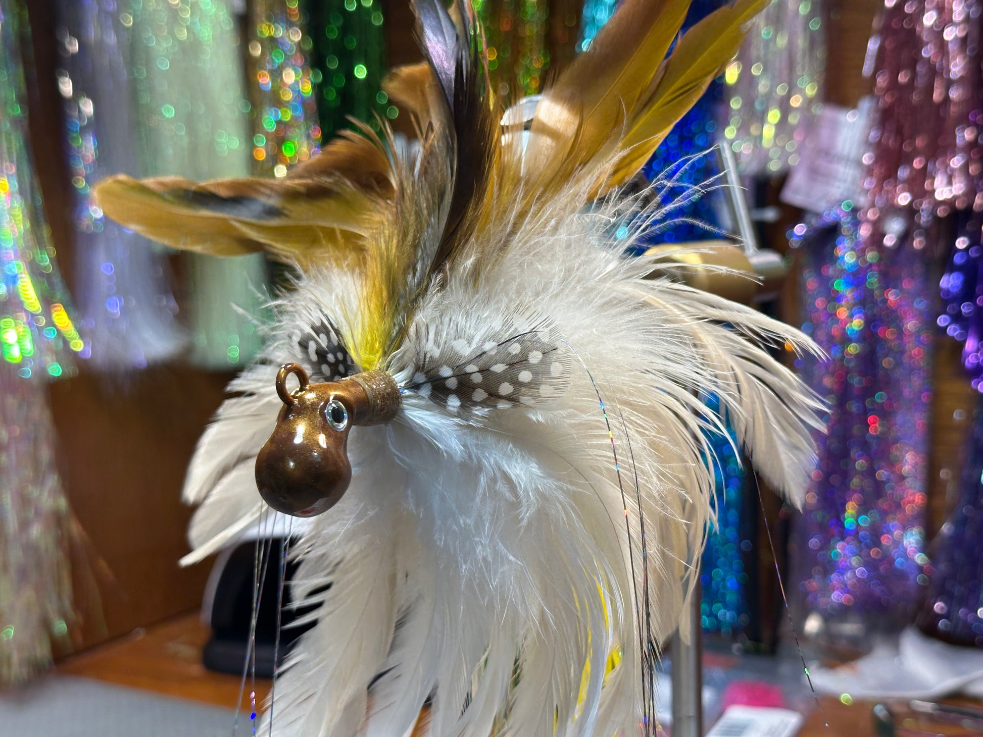 *Jig appearance may vary slightly based on material availability at time of order, we are a custom shop not a mass producer. Every jig is artistically made and not a "cookie cutter" product. At time it may be required to use a similar but alternate color jig head based on availability. Standard overall length is 7-9" and mainly dictated by the feathers available at time of hand-tying your jig. Contact us for special requests or more information prior to ordering.