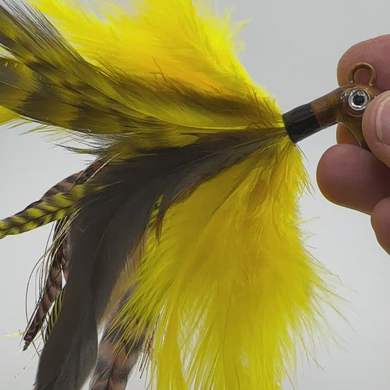 Yellow Feathers with Grizzly/Mottle Accents, Brown & Yellow Tail with Octopus head with Mustad 8/0 2x Strong Hook